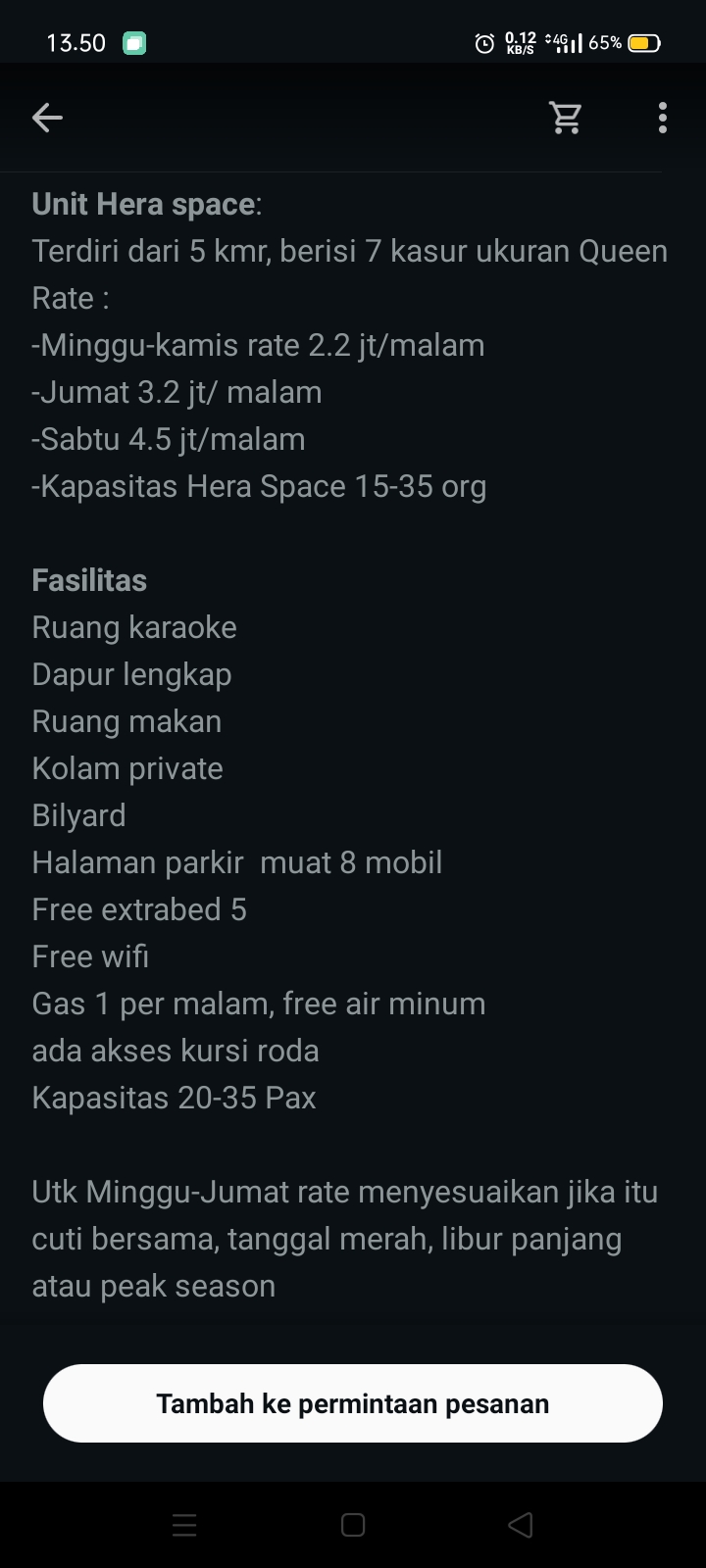 Umumnya Check-in 14.00 WIB dan Check-out 12.00 WIB, tergantung kebijakan villa.